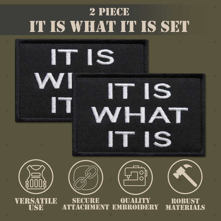Elevate your style and make a statement with our exclusive 2-piece set of "It is What It is" patches. Expertly designed with full embroidery, these badges offer a unique way to personalize and enhance any item, from dog vest harnesses and tactical gear to everyday wear like caps, bags, and jackets.