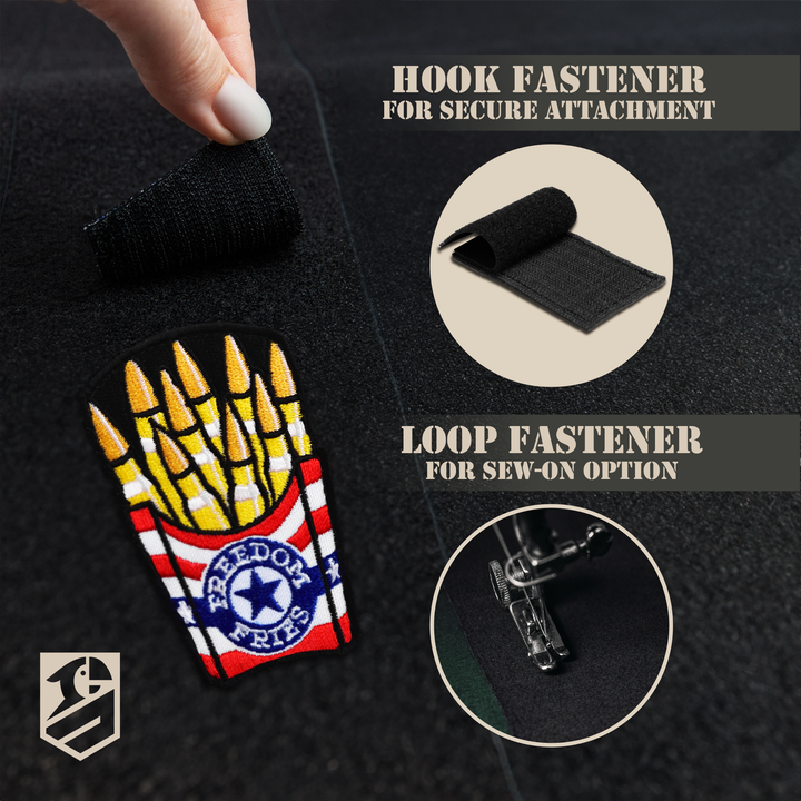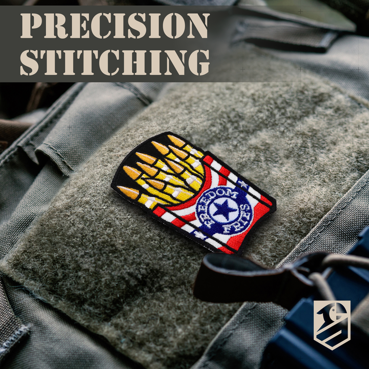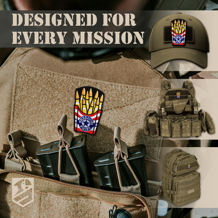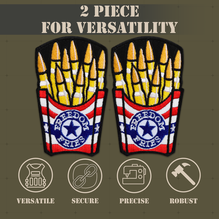 TWO PATCH SET, BUILT FOR TACTICAL GEAR – Includes 2 embroidered Freedom Fries patches, each measuring 2×3 inches (5×8 cm); perfect for tactical backpacks, vests, dog harnesses, helmets, or any loop-compatible gear.