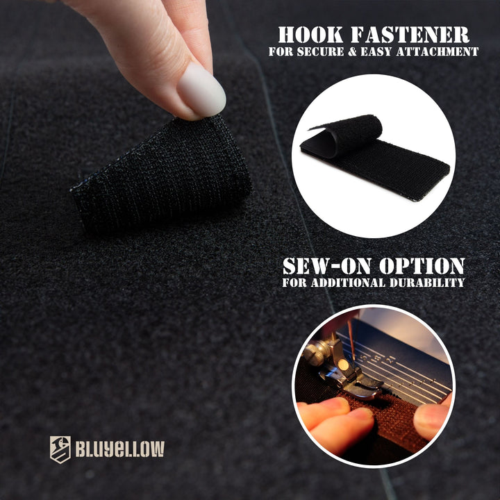 • Backing: Hook backing for instant attachment; loop piece included for optional sew-on use